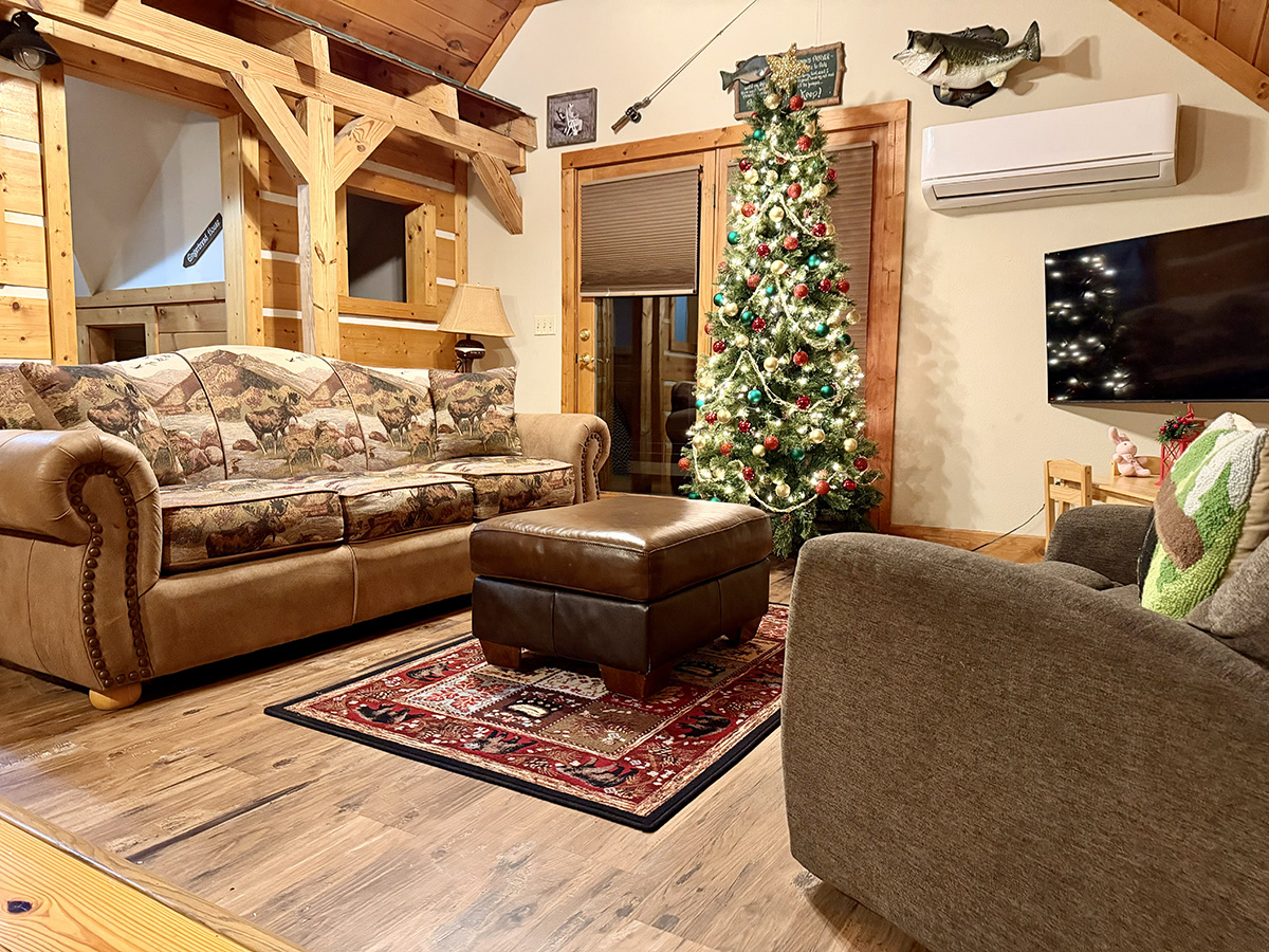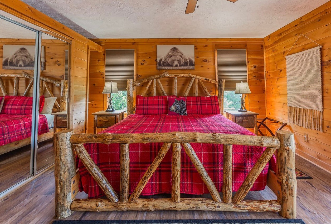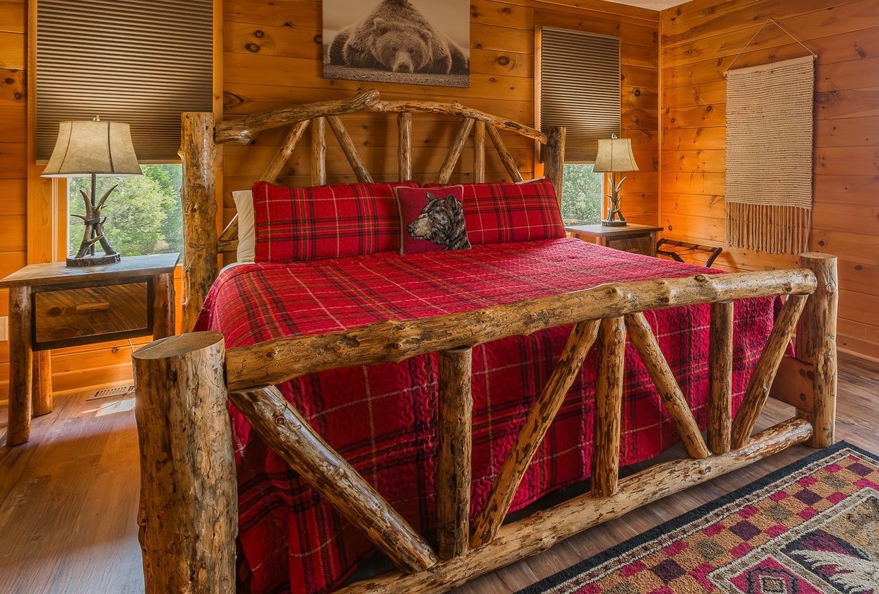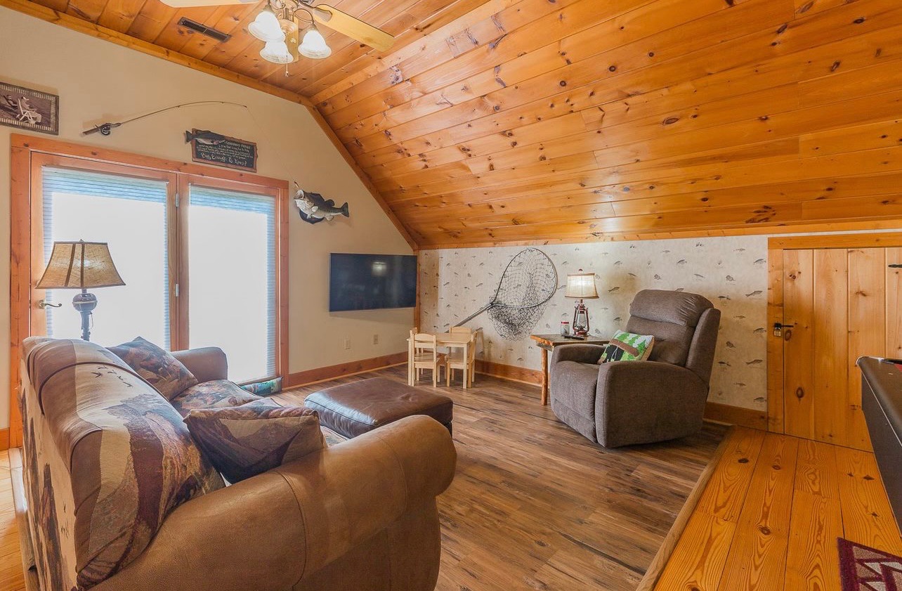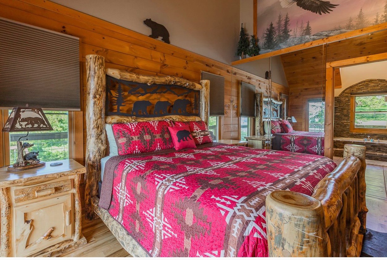 You will find 4 bedrooms with king beds. Three bedrooms are all on lower level, while we have a sofa queen sleeper upstairs. All bedrooms have 55 inch 4K smart TV and cedar closets. The master bath has a large soaking tub with a custom waterfall! Downstairs is an open floor plan with a 20 foot ceiling in the living room. WiFi for the lodge is 100m. TV service is provided by YouTube TV.
